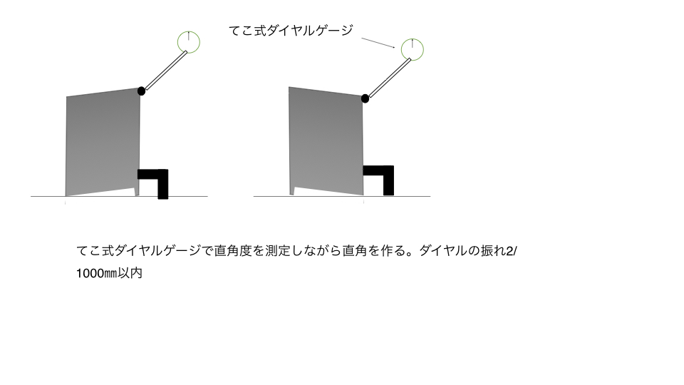 加工前のブロックは、平面研削盤で上下面を仕上げていても、側面は旋削・フライス加工のままで傾きが残っていることが多い。まずノギスや直角定規で大まかな傾きを確認し、どちら方向にどの程度傾いているかを把握しておく。